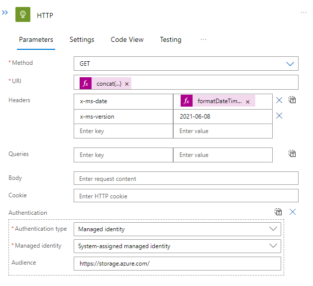 x-ms-versionは現在の最新でよいので、2021-06-08を指定する。AuthorizationはManaged Identity認証を使うので、ここでHTTP Headerとして明示的に指定する必要はない。