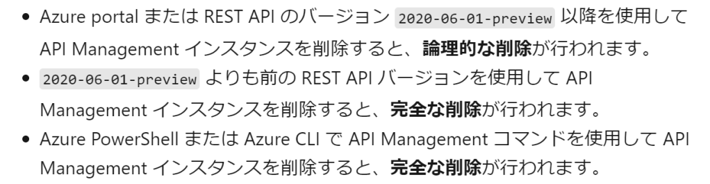 Azure API Managementのインスタンスを作成したが、選択したSKUが所望のものではなかったので、Azure Portalから一旦削除してから再度同じ名前、異なるSKUで作成しようとしたところ、エラーになった。なぜ?