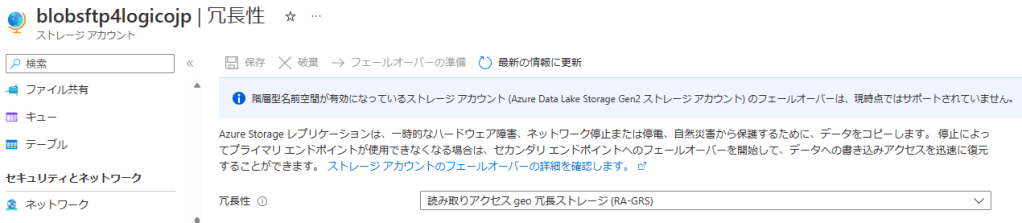 Storage accountをRAーGRSで作成し、Blob コンテナーを作成しておく。SFTP機能の構成は以下のドキュメントを参照。