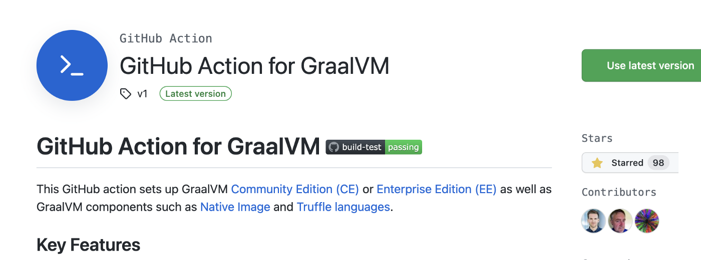 GraalVM (CommunityおよびEnterprise)、Native Image、Truffle言語とツールを簡単にセットアップして使用できるGitHub Action for GraalVMもリリースしました。現在、600以上のプロジェクトで使用されています(2023/01/08現在704プロジェクトで利用されています)。