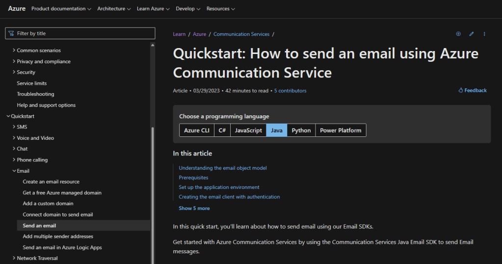 メール送信の例も、以前はC#、JavaScriptだけだったが、今ではJava、Python、Power Platform、Azure CLIも用意されている。