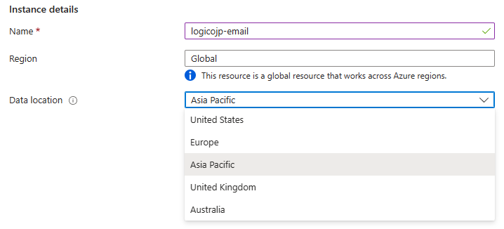 と記載していたが、2023/04/06現在、データの配置場所としてUSだけでなく、Australia、Asia Pacificも入っている。ただ、明示的に日本とは記載されていない。Communication ServicesとEmail Communication Serviceを接続するためには、地理的に同じ場所になくてはならないので、もし日本から一番近いところで作成するのだとしたら、Asia Pacificに作成せざるを得ない。
