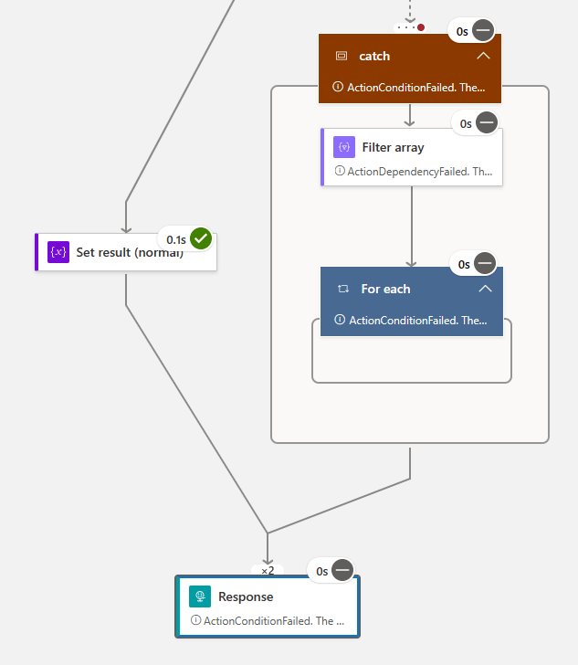 もし上の例でResponseアクションの実行条件からスキップ時を省くと、例えば正常実行フローでSet_result (normal) アクションが動作した後、Responseアクションは動作しない。これはcatchスコープ由来の実行条件を満たさないために実行がスキップされるため。