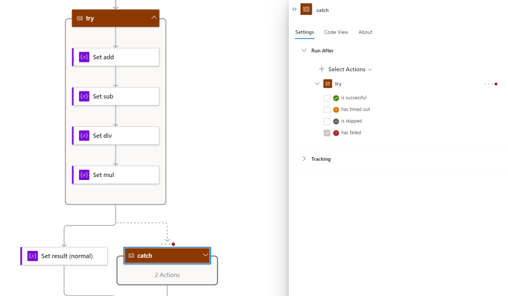 下図右の場合、各アクションは成功時および失敗時に動作するよう実行条件が設定されている。このような場合、Set_divというアクションでゼロ除算が発生したとしても、Set_mulが実行されるため、Set_mulの実行結果がtryスコープの結果として扱われる(ゼロ除算時にも成功する可能性がある)ので、注意が必要。