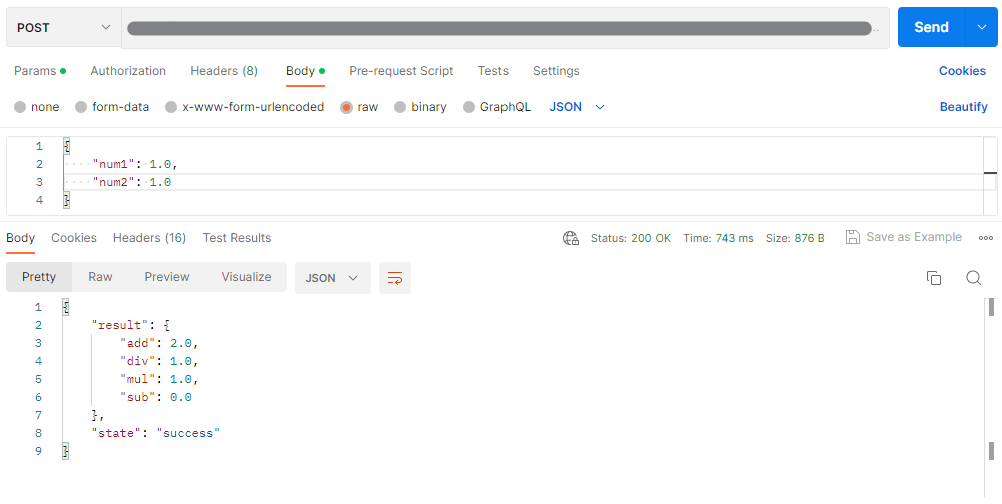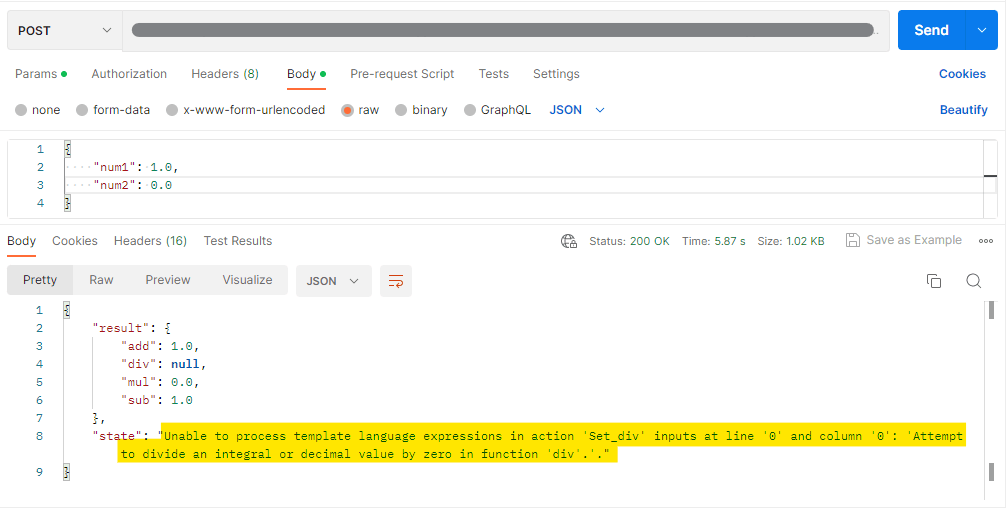 2個の数値を渡し、その数値を加減乗除した結果を返す、というシンプルなフローを考える。除数がゼロの場合、ゼロ除算になって例外が発生するので、エラーの理由を付けて応答を返し、例外が発生しなければ、そのまま結果を返すようにしたい。具体的には、以下のような動作を期待している。