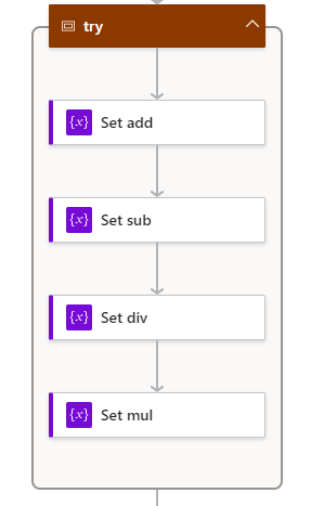 下図左のような場合、すべて首尾よく成功すれば当然成功ではあるが、例えばSet_divというアクションでゼロ除算が発生した場合、Set_mulというアクションはスキップされるので、この場合Set_divの結果がtryスコープの結果として扱われる(ゼロ除算時でtryスコープは失敗)。