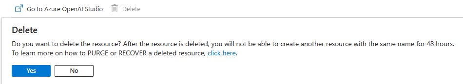 この画面から、Recover(復旧)もしくはPurge(パージ)を選択すれば復旧もしくはパージする。今回は同名のAOAIリソースを作成したいので、Purgeをクリックし、確認メッセージに対してConfirm(確認)すればパージできる。