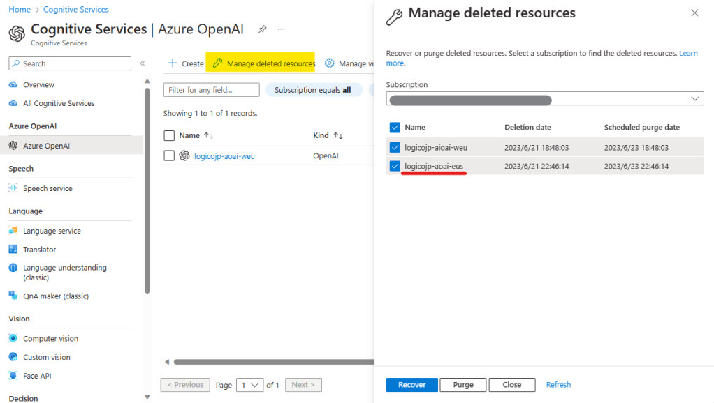 パージや復旧は、ドキュメントの通り、Cognitive Services API の種類のハブに移動し、メニューから Manage deleted resources(削除されたリソースの管理)を選択すると、右側に削除したAOAIリソースが現れる。先ほど削除したAOAIリソース(赤下線)も発見できる。