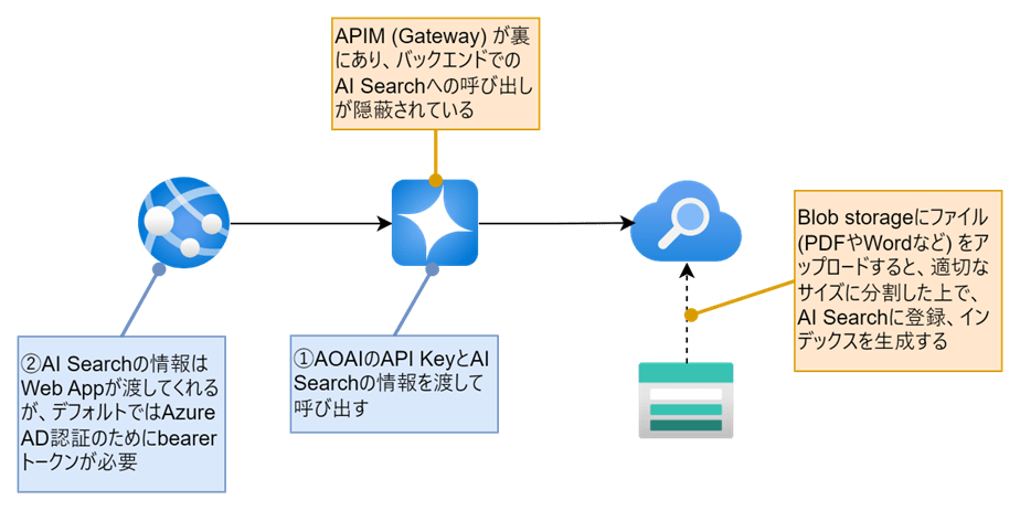 上記のブログエントリに記載されているが、このAPIは下図のように2個の経路、一つはAOAIから、もう一つはWeb Appから呼び出すことができる。