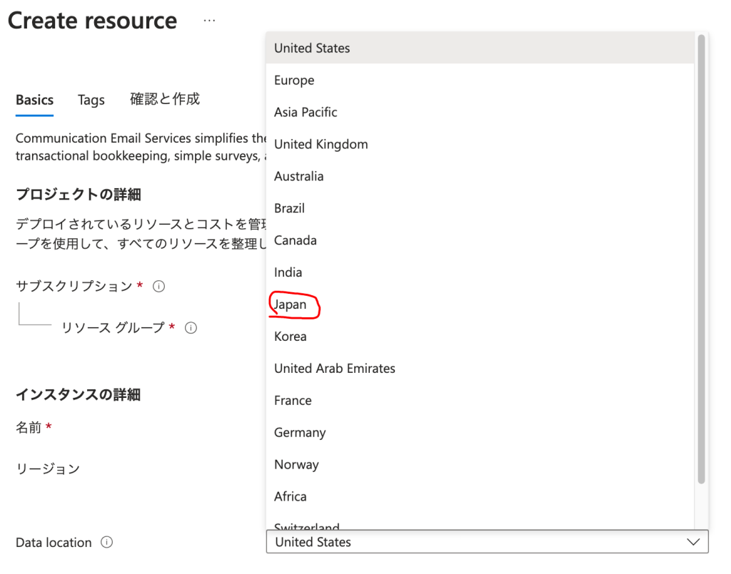 2023/04/06現在、データの配置場所としてUSだけでなく、Australia、Asia Pacificも入っている。ただ、明示的に日本とは記載されていない。Communication ServicesとEmail Communication Serviceを接続するためには、地理的に同じ場所になくてはならないので、もし日本から一番近いところで作成するのだとしたら、Asia Pacificに作成せざるを得ない。