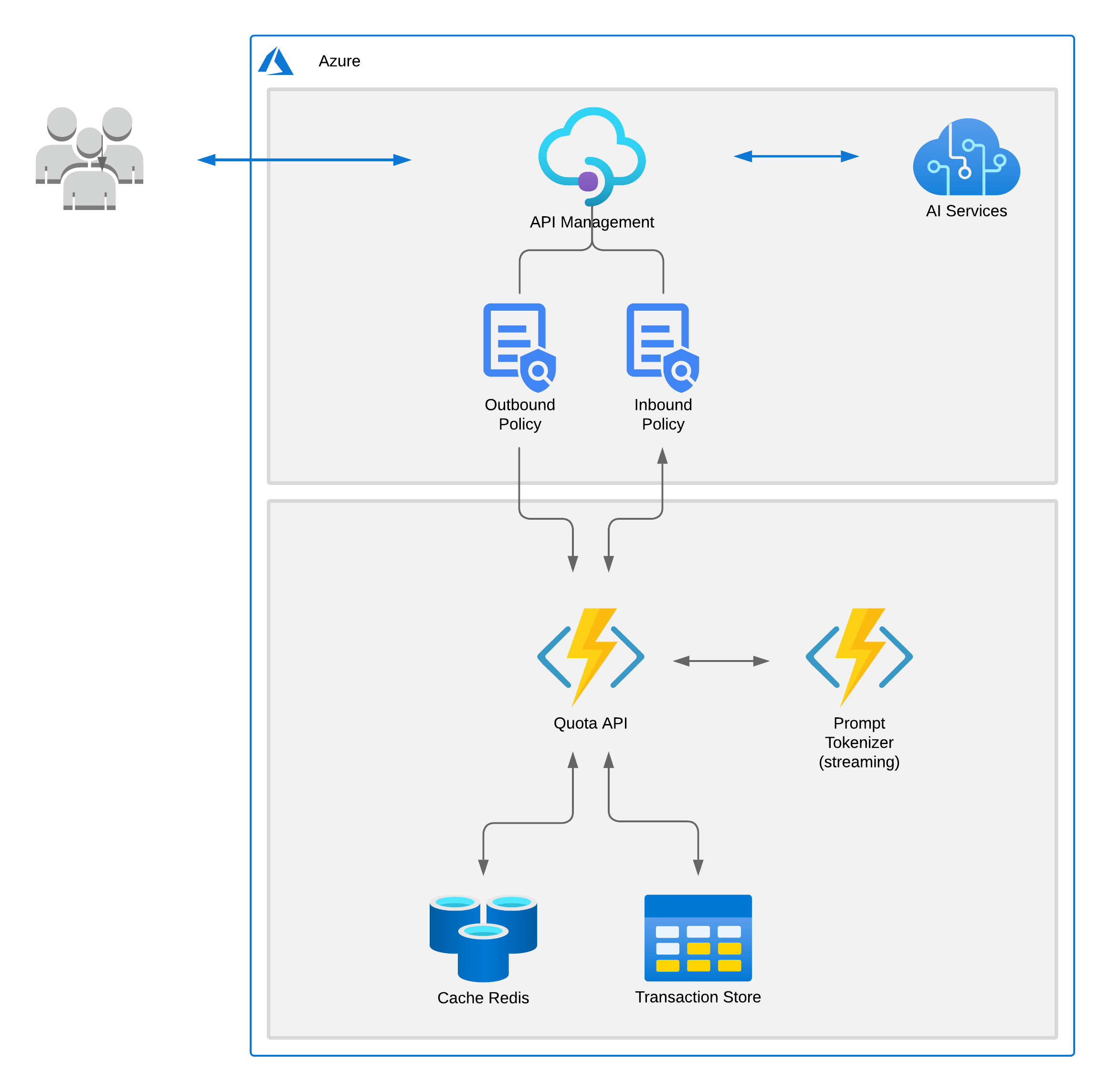 APIMのOutboundセクションでAOAIからのレスポンスに含まれるUsageの要素をsend-one-way-requestポリシーを使ってAzure Cache for Redisに書き込み、Cacheの値を加算していく。APIMのInboundセクションでは、send-requestポリシーでCacheに保持されている利用トークン数をチェックし、上限を超えていればreturn-responseポリシーで429(もしくは403)を返す。