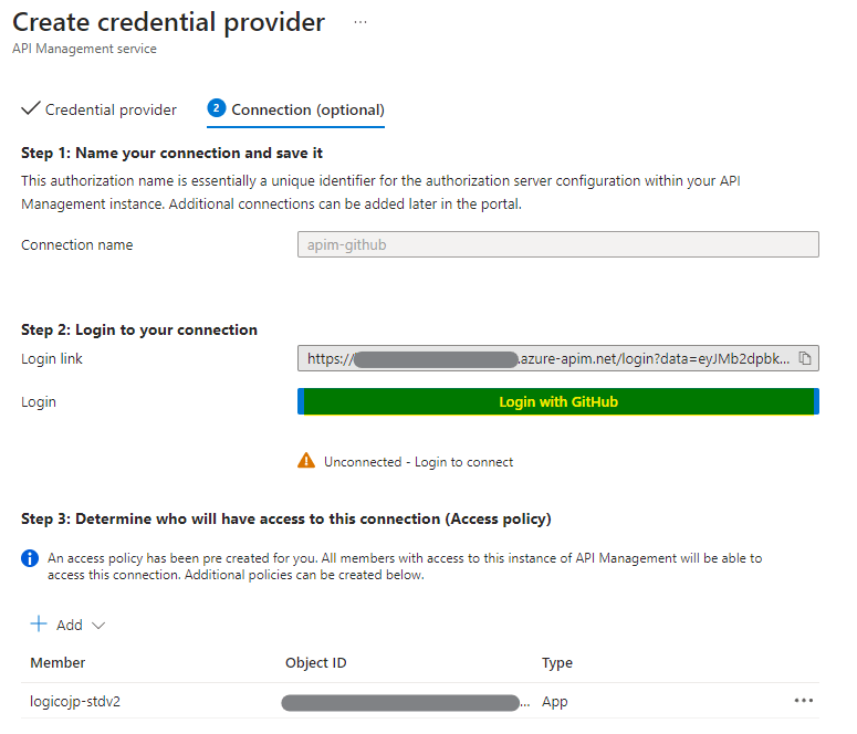 5) 保存すると、「Step 2: Logic to your connection」(手順 2: 接続にログインする)という表示が現れるので、【Login with GitHub】をクリックしてログインしておく。ログインが完了すると、UnconnectedからConnectedに表示が変わる。