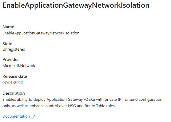 この機能はサブスクリプションでPreview機能を有効にする必要があるが、その設定がもののみごとに”EnableApplicationGatewayNetworkIsolation”。