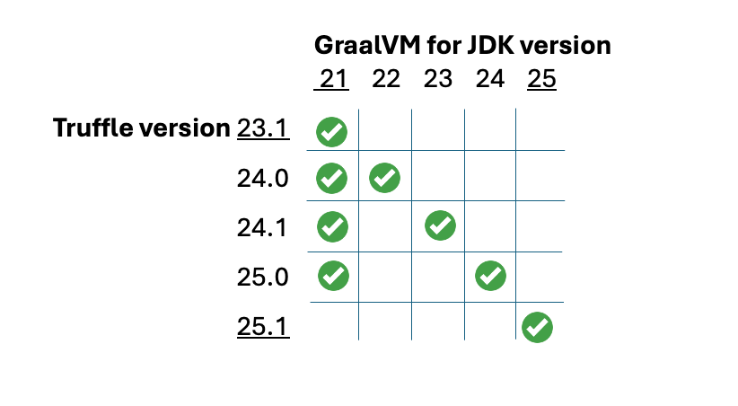 将来、TruffleとGraal言語の最新バージョンは、最新のLTSリリースと同様に、GraalVM JDKの最新バージョンとの互換性を維持する予定です。これはつまり、GraalVM JDKの現在のLTSリリースのままで、最新のPolyglot言語機能を使用できる、ということです。
