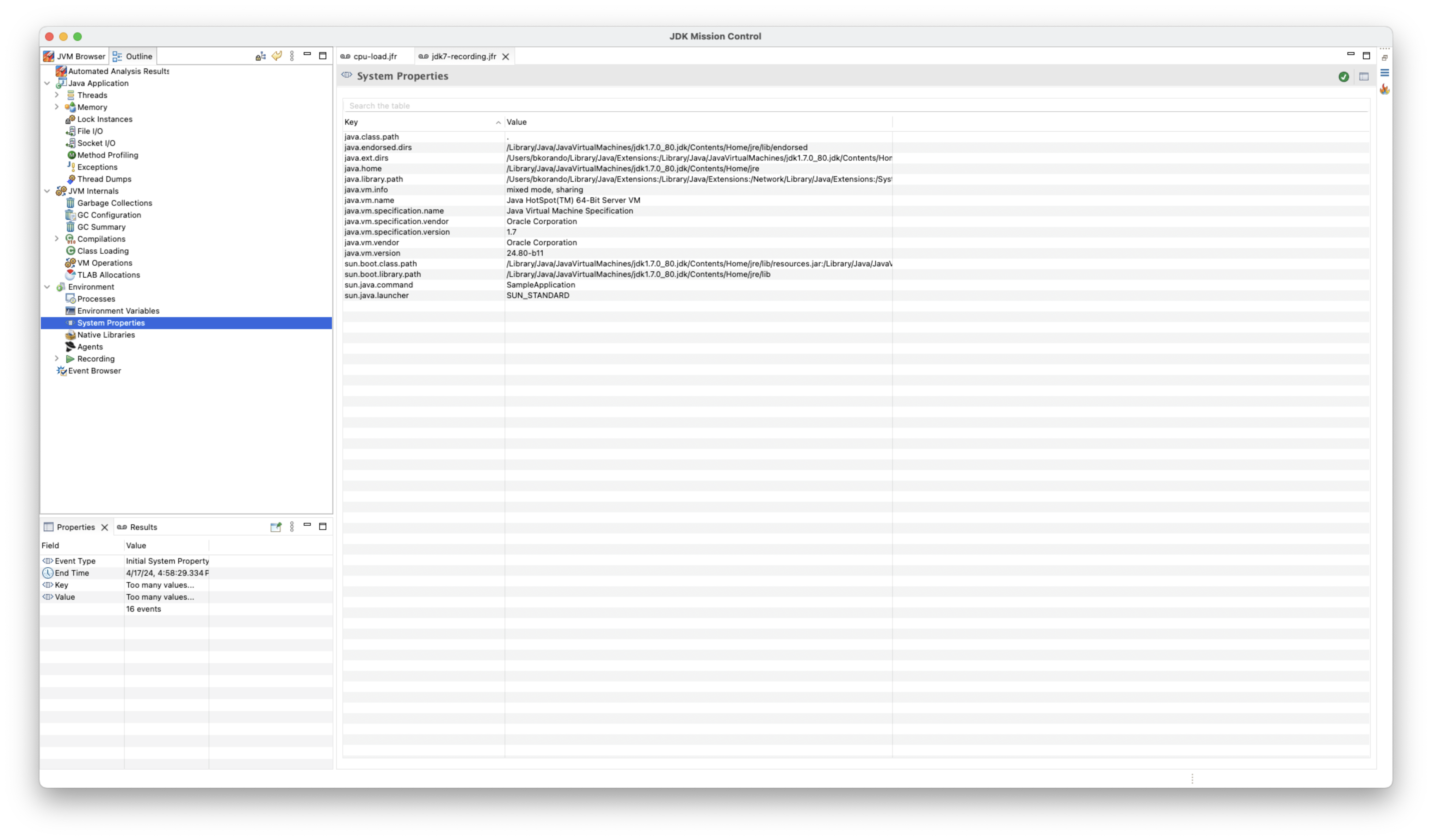 とはいえ、JDK 17がJMC実行で必要ではありますが、JDK 7u40以後のJFR記録はこれまで通り読めます。以下はシンプルなJDK 7のアプリケーションからの記録の例です。