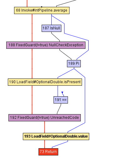 上図では、getAsDoubleの呼び出し(ノード71)が中間表現から消えていることが分かります。(volleyballStarsメソッドの最後に呼び出される)IntStream.averageが返すOptionalDoubleオブジェクトのgetAsDoubleメソッドは、JDKでは次のように定義されています。