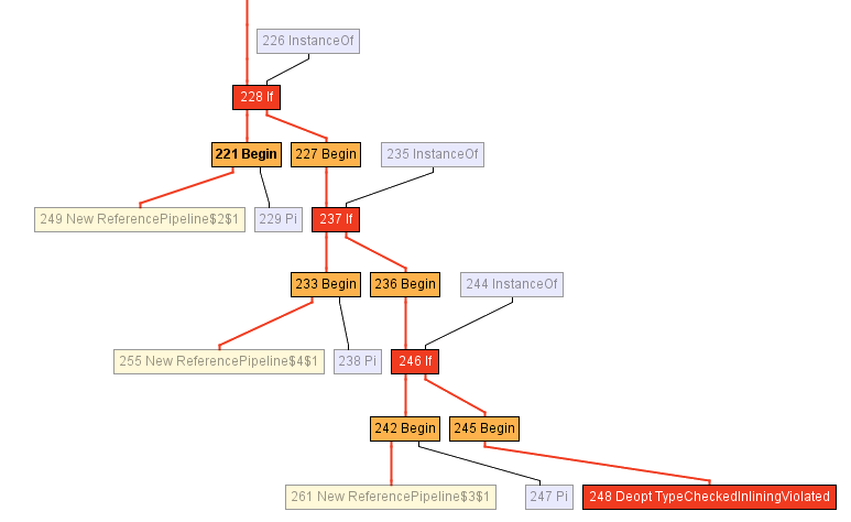 この情報はコンパイラにとって非常に重要です。なぜなら、これはtypeswitch(実行時にメソッドの型をチェックし、それぞれの場合に具体的なメソッドを呼び出す短いswitch文)の実行を可能にするからです。中間表現の次の部分では、レシーバの型が ReferencePipeline$2、ReferencePipeline$3、ReferencePipeline$4のいずれかであるかをチェックするtypeswitch(3個のIfノード)があります。それぞれのInstanceOfのチェックの成功分岐における直接呼び出しは、それぞれインライン化でき、他の最適化も可能です。いずれの型にも一致しない場合は、Deoptノードによってコードの最適化を解除します(あるいは、代わりに仮想ディスパッチが発生します)。