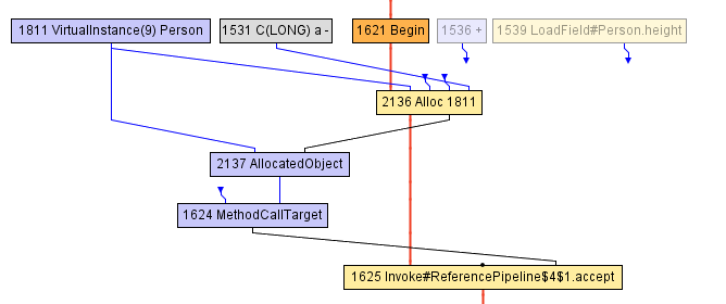 volleyballStars メソッドのコンパイルの過程で、ある時点で以下の中間表現に到達します。Beginノード 1621で始まる aブロックは、(Allocノードにおける)Personオブジェクトの割り当てから始まり、ageフィールドの値を1増やし、以前のheightフィールドの値で初期化します。heightフィールドは、LoadFieldノード1539で事前に読み込まれています。割り当ての結果はAllocatedObject(ノード2137)にカプセル化され、acceptメソッド(ノード1625)の呼び出しに転送されます。この時点でコンパイラが実行できることは他にありません。コンパイラの観点では、オブジェクトは事実上volleyballStarsメソッドから抜けます。