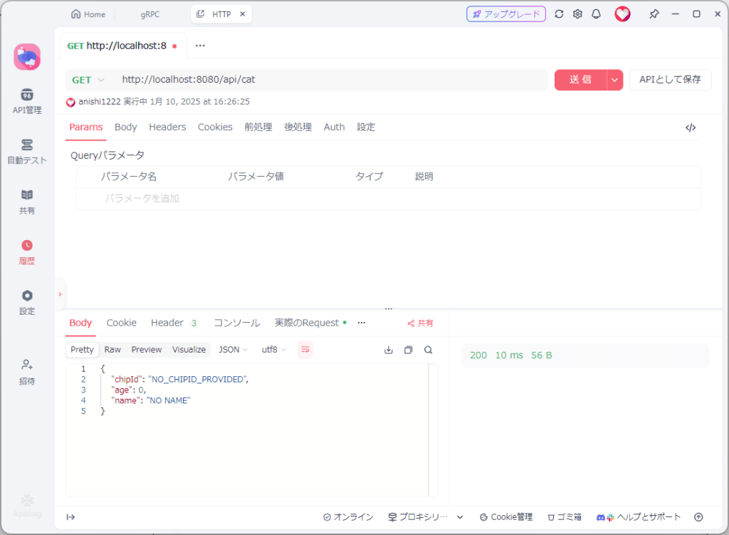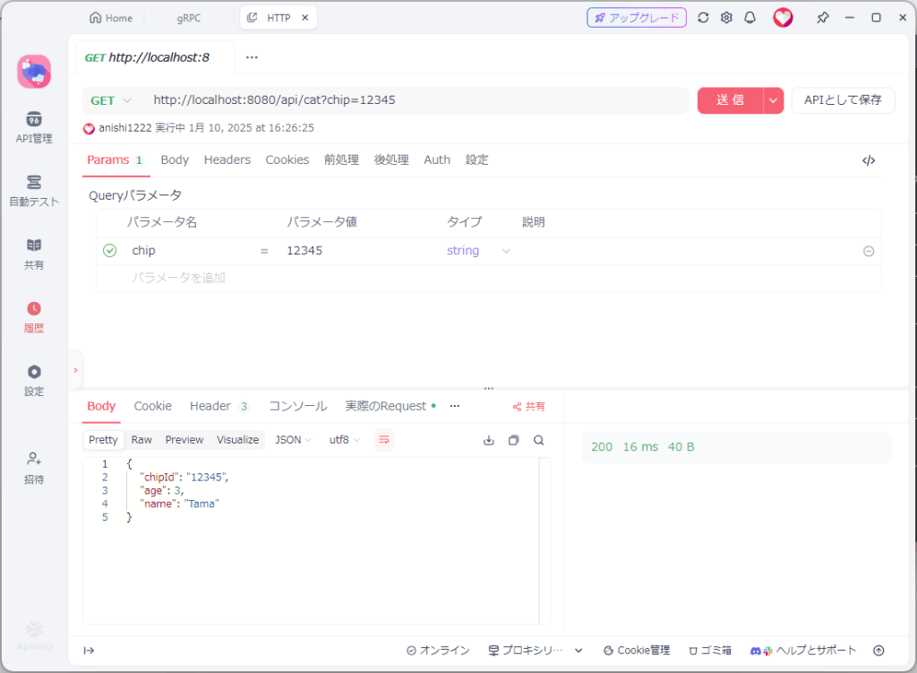 作成したgRPC Clientを実行しておく。REST APIとして作成したので、ポートを明示的に指定していない限り、tcp/8080をリスニングポートとして利用する。こちらもApidogから呼びだしてみると、問題なく動作していることがわかる。