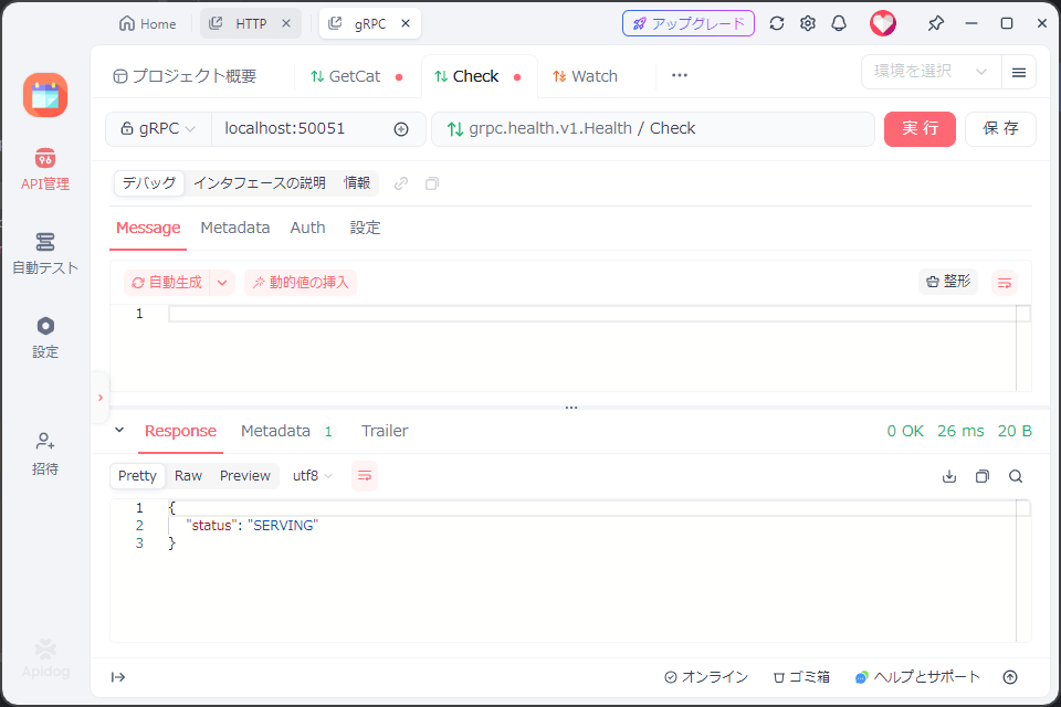 gRPCのテストクライアントを使って動作確認。Postmanでも何でもよいが、今回はApidogを使っている(実際のところ、chip_idとして文字列を指定していなくても動作するようにしている)。