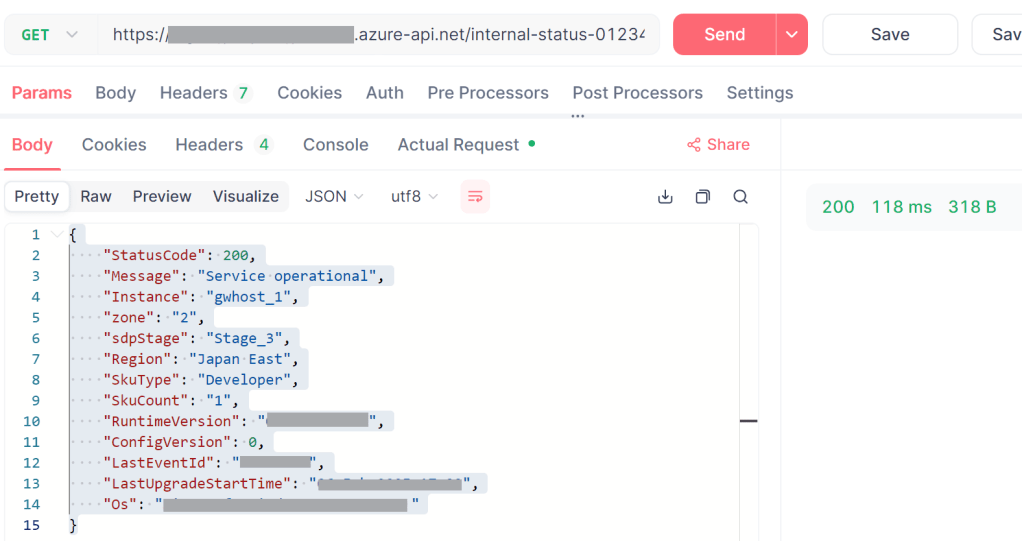 「ほしがるねぇ」というのが第一印象。上記エントリには、GETで /status-0123456789abcdef を呼び出す、という例が記載されていて、これを使えば、APIMのGatewayが正常に動作していればHTTP 200が返る。これよりももうちょっと細かい情報は取れないのか、ということのよう。