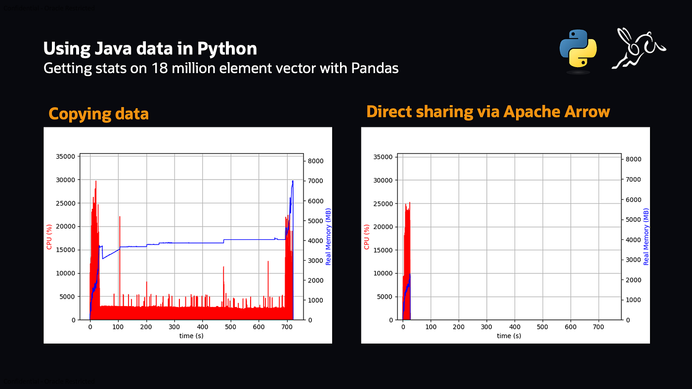 2つ目の実験的な機能は、GraalPyに言語非依存のデータ表現であるApache Arrowを新たに統合したことです。これにより、JavaとPythonのオブジェクトレイアウトをコピーしなくても、大量のデータをJavaとPythonの間で直接共有できるようになりました。これにより、例えばPandasなどの一般的なPythonパッケージをJavaから使用する場合など、共有データの処理時間を大幅に短縮できます。