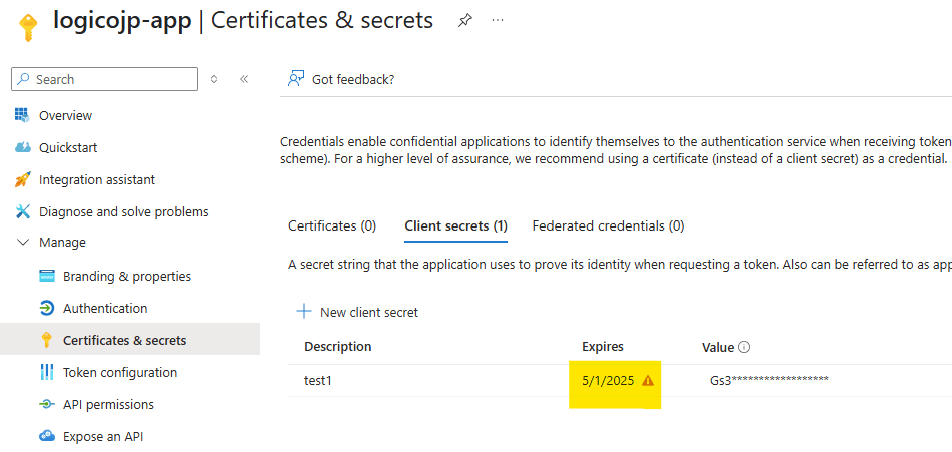 で、このシークレットが期限切れを迎えるのでどうしたものか、ということのよう。Portalを確認すると、シークレットは再作成はできないので、新規にシークレットを追加するしかない。ただ彼らには新規作成の権限がないので、詰んだ状況である、ということのよう。