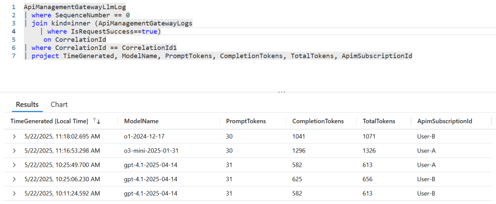 個々人やグループごとにAPIMで発行したSubscription Keyを使って、各ユーザーのToken usageを月次で集計したい、なんてのはよくあるユースケースだが、今回の機能追加のおかげで、ApiManagementGatewayLlmLogとApiManagementGatewayLogsを使えば計算できるようになっている。結合に使う条件はCorrelationIdを使う。