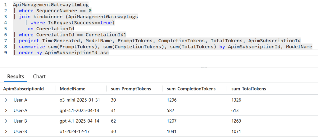 | summarize sum(PromptTokens), sum(CompletionTokens), sum(TotalTokens) by ApimSubscriptionId, ModelName