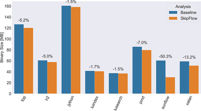 RenaissanceおよびDacapoベンチマークスイートおよび一連のマイクロサービスアプリケーションを使用してSkipFlowを評価しました。以下に示すのは、マイクロサービスアプリケーションの一連の例におけるバイナリサイズへの影響を示すチャートです。SkipFlowは、ビルド時間へ悪影響を与えずに、ネイティブイメージのサイズを平均4.4%削減します。実際、SkipFlowを有効にすると、分析およびコンパイル対象のメソッドが減少するため、イメージのビルド時間はむしろわずかに高速化される傾向にあります。