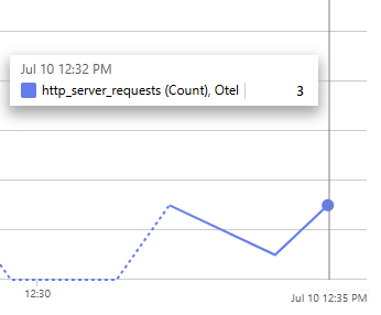 Application Insightsの値と一致していることを確認するため、たとえばhttp.server.requestsというメトリックを確認すると、グラフ上は3件で、APIの応答も3件であることがわかる。