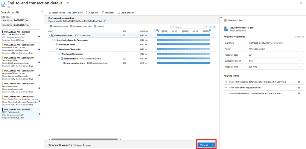 各Traceの詳細は赤枠で囲んだView allをクリックすると確認できる。