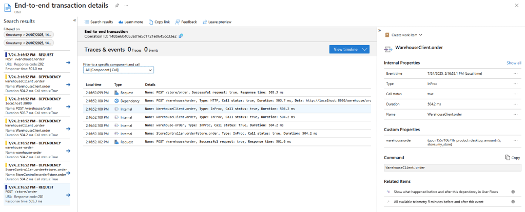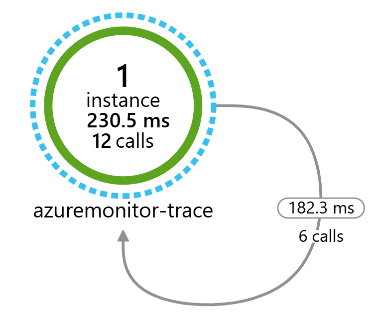 azuremonitor-trace内では、内部でHTTP Clientを使って POST /warehouse/order を実行している。Azure Monitor (Application Insights) のApplication Mapを見ると、azuremonitor-trace自身に対しての呼び出しが発生していることを確認できる。