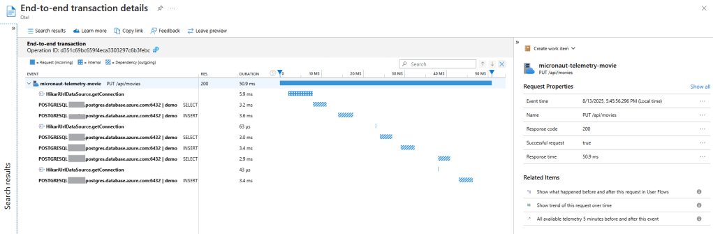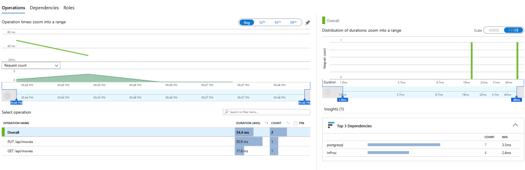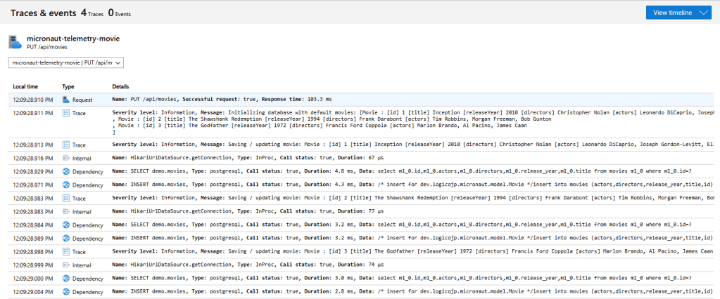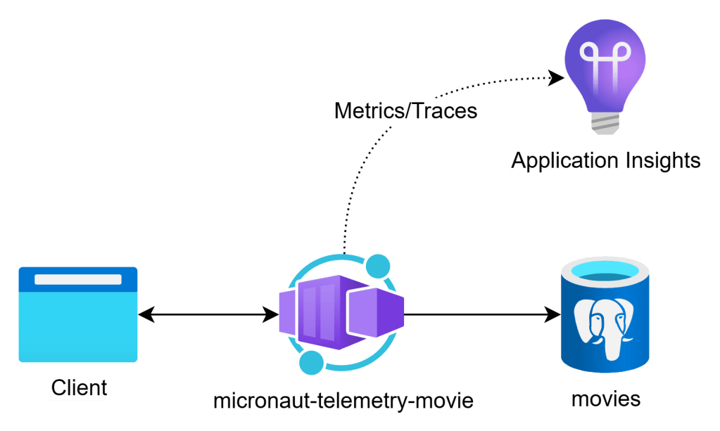 このサンプルは映画の情報を取得・追加・更新・削除できるREST APIで、データストアとしてPostgreSQLを利用し、Azure Monitor、厳密にはApplication InsightsにTraceとMetricを送信する、というもの。コードは以下にある。