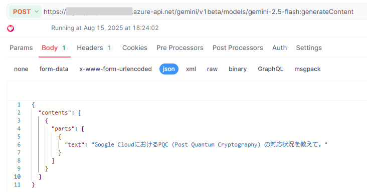 Azure Portalからでも、REST API Clientからでもよい。まずはStreamingを使わない場合。いずれのケースでもGemini 2.5 Flashを使っている。