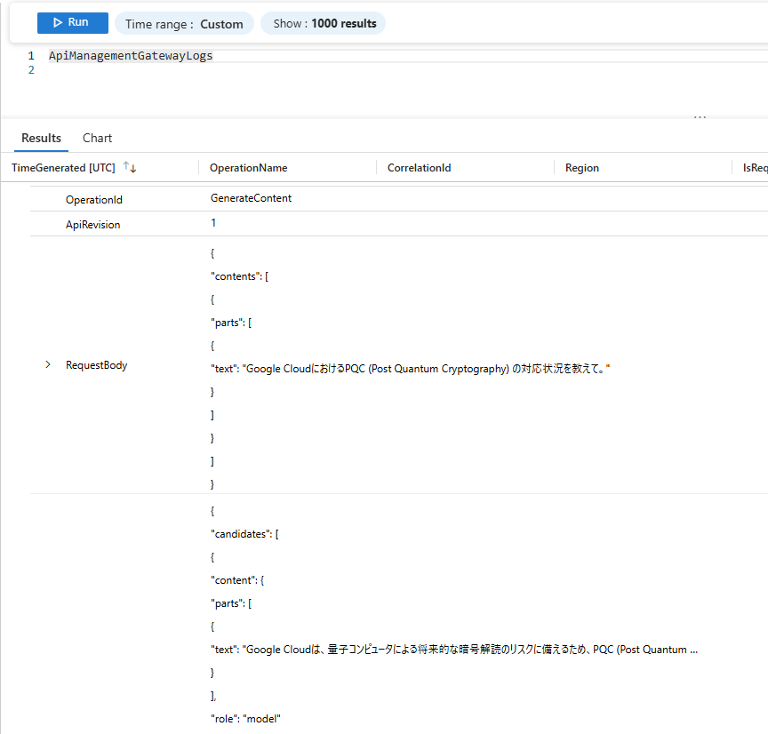 では、Log Analytics WorkspaceでApiManagementGatewayLogsを確認すると、先ほど紹介したような形で格納されていることを確認できる。