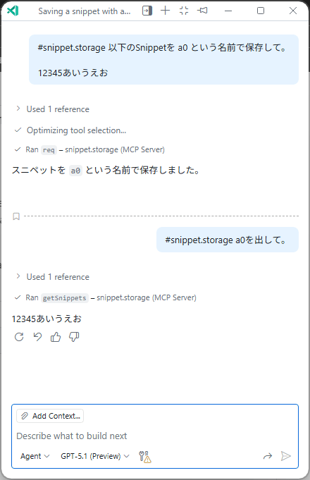 GitHub CopilotをAgentモードで使うのと同じお作法。MCP Serverを指定すると以下のような感じ。
