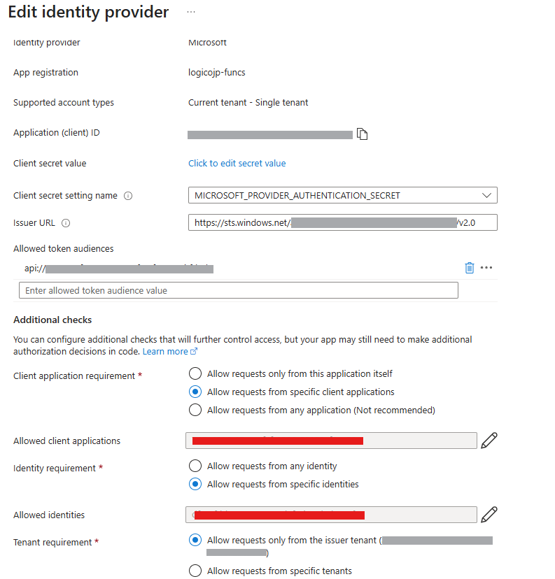 Easy Authだけで完結させたいなら、クライアントアプリケーション、IDの要件を設定すればよい。この問い合わせ主の例ではSystem Assigned Managed Identityの情報を追加する。