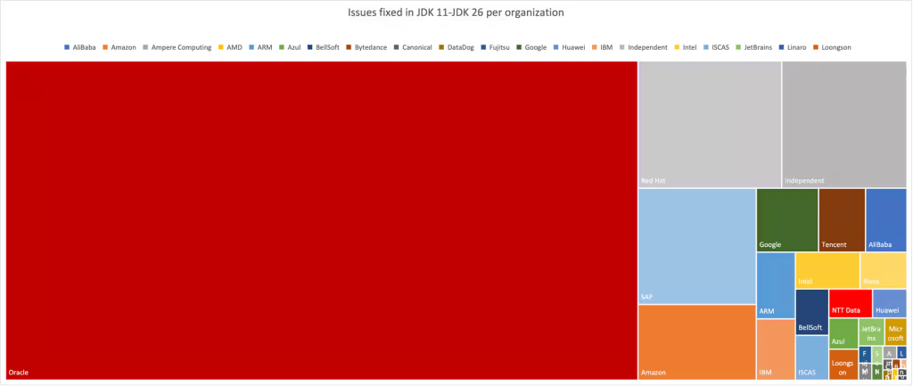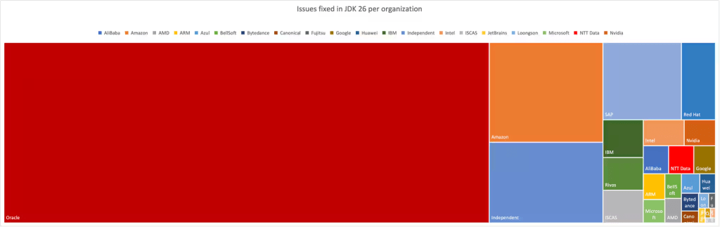 Java 26では、修正済みとマークされた2,535件のJIRA Issueのうち、1,729件はOracleの従業員が完了し、806件はJavaコミュニティの他のメンバーによる貢献でした。