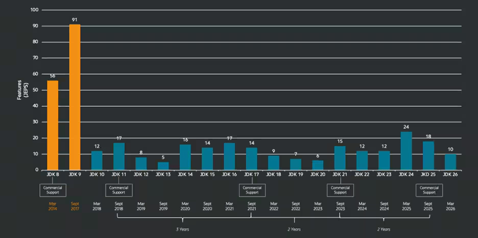 JDK 26は、6か月ごとのリリースサイクルを通じて予定通り提供された17番目の機能リリース(feature release)です。このレベルの予測可能性により、開発者は着実な改良の流れのおかげで、イノベーションの採用を容易に管理できます。