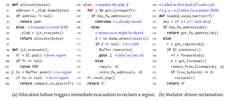 _tlab is a thread-local allocation buffer (a region that fast-path allocations go into).(mark–scavenge(左と中央)とミューテーター再配置(右)における割り当てエラーの処理。変数_tlabはスレッドローカルな割り当てバッファ(高速パス割り当てが格納される領域)。)退避やリージョン圧縮に使われる有効性情報では、控えめではありつつも多めに見積もるのが一般的です。したがって、以下で詳しく説明するように、メモリを高速に利用可能にするためのコストは、デッド・オブジェクトの再配置のリスクが高まることを意味します。