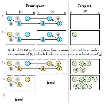 Fig. 6は、Fig. 1a、Fig. 1bと同じ初期ヒープを示しています。この例では、領域𝑝1と𝑝2が退避対象として選択されており、GCワーカーがオブジェクトを発見すると、それらのオブジェクトを𝑝3に移動させます。𝑡2で、オブジェクトaが𝑝3に移動されます。同時にシステムはOOMに近づいているため、mark–scavengeアルゴリズムが即時退避のために空きの多い領域を選択します。この例では𝑝2です。