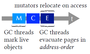concurrent GCにおける 2 段階アプローチの欠点は、退避を促すマーキング中に収集された有効性情報が、実行時に古くなっている可能性があることです(Fig. 1b において、オブジェクト𝑎は𝑡1では有効とマークされていたが、その有効性情報は、𝑡7におけるオブジェクト𝑎の到達可能性に関係なく、𝑡7まで適用されません)。有効であるとマークされたオブジェクトがその後無効化したり到達不能になったりする確率は、有効であるとマークフェーズの長さに比例して増加します。§2.4で、これが退避中に厳密には不要なオブジェクトのコピーを生成することにつながることを見ていきます(これらのすべてのGCは世代別GCです。これらのGCは通常はマーク時間を短くして、有効性情報を新鮮に保つべきであることに注意してください)。