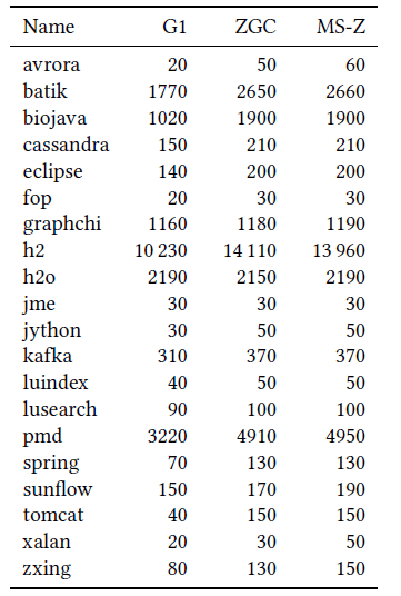 スレッド数は明示的に設定せず、ベンチマークに事前定義された動作を使用しました。Table 3に、JVM が報告した、DaCapo ベンチマークで使用した平均 Java スレッド数(つまり非VM)を示します。SPECjbb2015では、平均スレッド数は360でした。スレッド数は、ヒープ・サイズの影響を受けませんでした。
