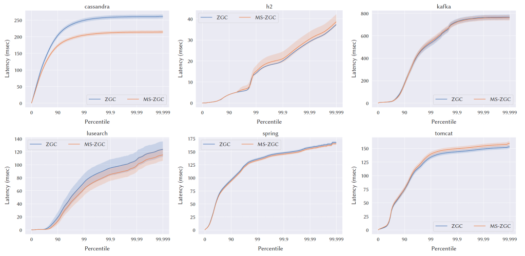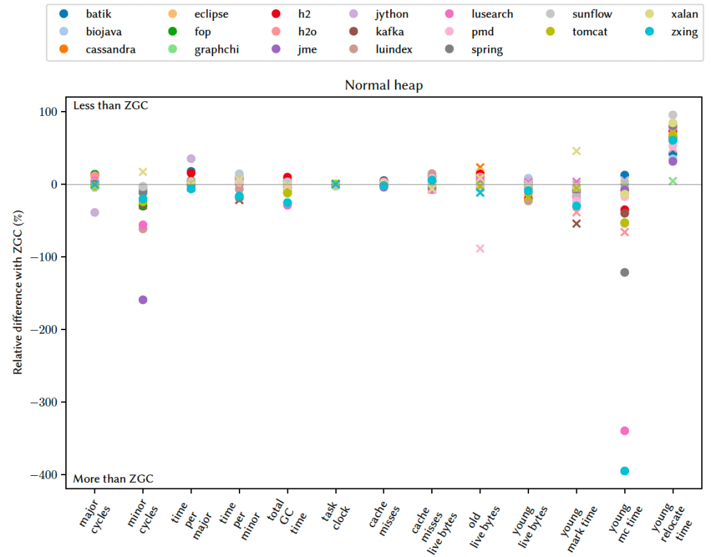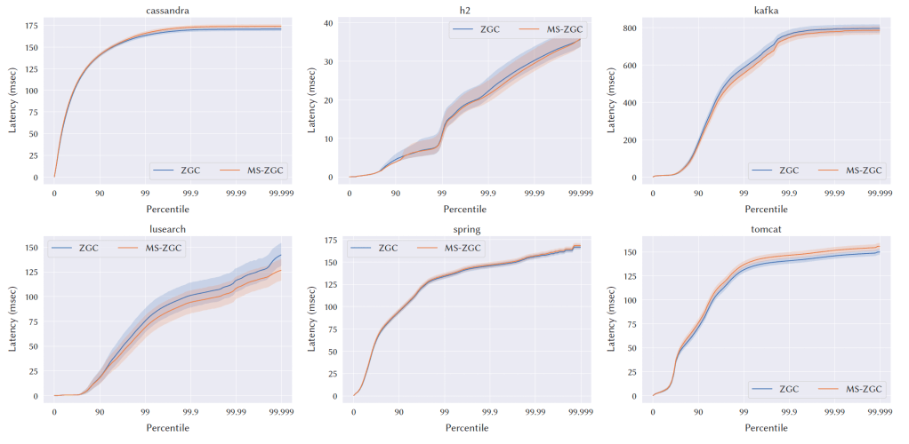 Table 3からわかる通り、DaCapoベンチマークでノーマルヒープについて、10個のアプリケーションには影響がなく、(2.8%の劣化が見られたsunflowを除き)8個のアプリケーションには0.21から1.5%の劣化が見られました。pmdは1.83%の改善が見られた唯一のアプリケーションでした。以前の研究で、sunflowではオブジェクトの割り当て順を維持することがパフォーマンスにとって極めて重要であることが示されています。そのため、MS-ZGCがリロケーションを線形からグラフ順に変更したため、最も大きな後退が見られたとしても驚くことではありません。