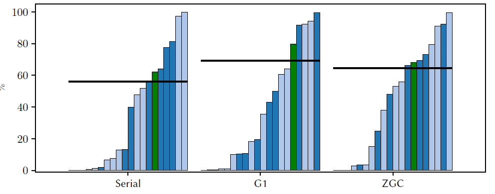 Fig. 2中の棒グラフの各棒は1つのベンチマーク結果を表しています。棒は昇順にソート、GCごとにグループ化済みです。すべてのベンチマークの傾向に関心があるため、プロットでは名前を省略して可読性を上げています。スループットのベンチマークとレイテンシのベンチマークは、後者を濃青色表して区別しています。SPECjbb2015と DaCapo 23.11-chopinベンチマークスイートを使用し、広範な様々なワークロードをカバーしました。