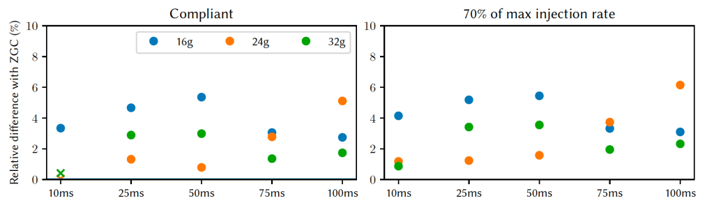 DaCapoでタイトヒープを使用した場合、8個のアプリケーションには影響がありませんでしたが、9個のアプリケーションで劣化が見られました。h2とtomcatのベンチマークでは、0.11~0.14%のわずかな改善が見られました。スループットの劣化は、特にcassandra、fop、h2oなど、一部のアプリケーションでより顕著でした。これは、プロトタイプでページロックによるfrom-spaceの割り当てのシリアライズが原因で劣化が発生したと考えています(§4.2.2参照)。当然ながら、同時並行アプリケーションのスループットに悪影響を及ぼします。Table 4は、SPECjbb2015の結果を示しています。スループットスコアのmax-jOPSは、最小の16GBのヒープでは影響を受けませんでしたが、24GBのヒープでは7.7~7.8%の大幅な改善が見られました。32GBのヒープでは、compliant実行で1.81%、最大注入率実行の70%で2.97%の改善が見られました。SPECjbb2015はマシンを飽和させるため、GCがパフォーマンスのクリティカルパスになります。というのも、ミューテーターとGCワーカーがCPUを競合して作業を行うからです。GCがパフォーマンスのクリティカルパスとなります。MS-ZGCは、40~50%のyoungオブジェクトの再配置を回避するため、GCはより高速に実行され、GCサイクルをより多く実行できるようになり、同じ時間でより多くのオブジェクトを解放できるようになります。ヒープサイズが増加すると、GCのパフォーマンスはプログラムのパフォーマンスにとってそれほど重要ではなくなるため、GCの効率が改善しても、小規模なヒープほどスコアが向上するわけではありません。