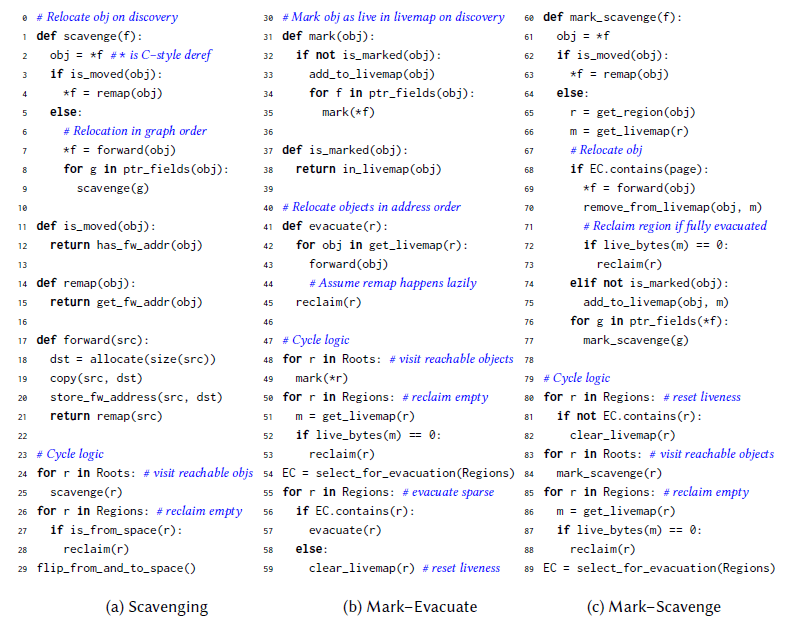 mark–scavengeサイクルは80行目から始まります。青字のコメントは、このセクションおよび前セクションで指摘したプロパティとコードの関係を大まかに示しています。mark–evacuateのコードはscavengingのコードの関数を再利用し、mark–scavengeのコードは両方の関数を再利用します。簡潔にするため、自明な名前を持つはずの単純なヘルパー関数の定義は省略します。Roots、Regions、およびECはグローバルリスト変数です。ECは退避のために選択されたRegionsのサブセットです。関数 scavenge()とmark_scavenge()はどちらも、変数またはフィールドへのポインタを引数にとり、転送(その変数またはフィールドが指すオブジェクトのコピー)または再マッピング(すでにコピーされたオブジェクトへのポインタを新しい場所に更新)の一環として引数を更新します。簡単にするために、割り当て(18行目)は常に成功すると仮定します。この単純化については、Fig. 5で再検討します。